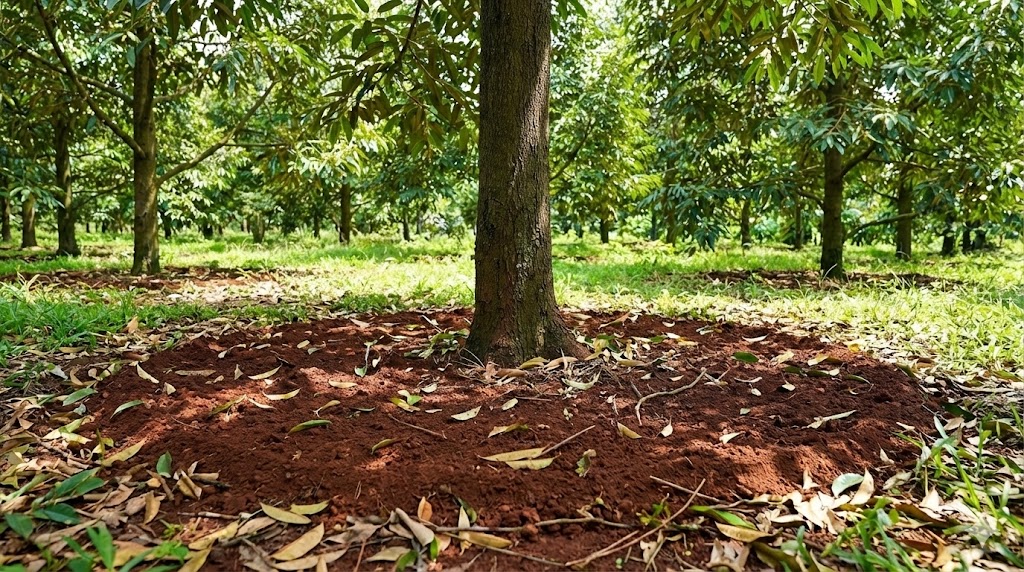 Khi đất còn ẩm ướt, việc đi lại hoặc sử dụng máy móc nông nghiệp sẽ khiến đất bị nén chặt (bí chặt). Đất nén chặt làm giảm độ thông thoáng khí (oxy), cản trở sự phát triển của rễ cám mới và tạo điều kiện cho các loại nấm kỵ khí gây hại phát triển mạnh mẽ hơn. Vì vậy, bà con chỉ đi lại khi thật sự cần thiết và tránh vùng đất ngay quanh gốc cây.