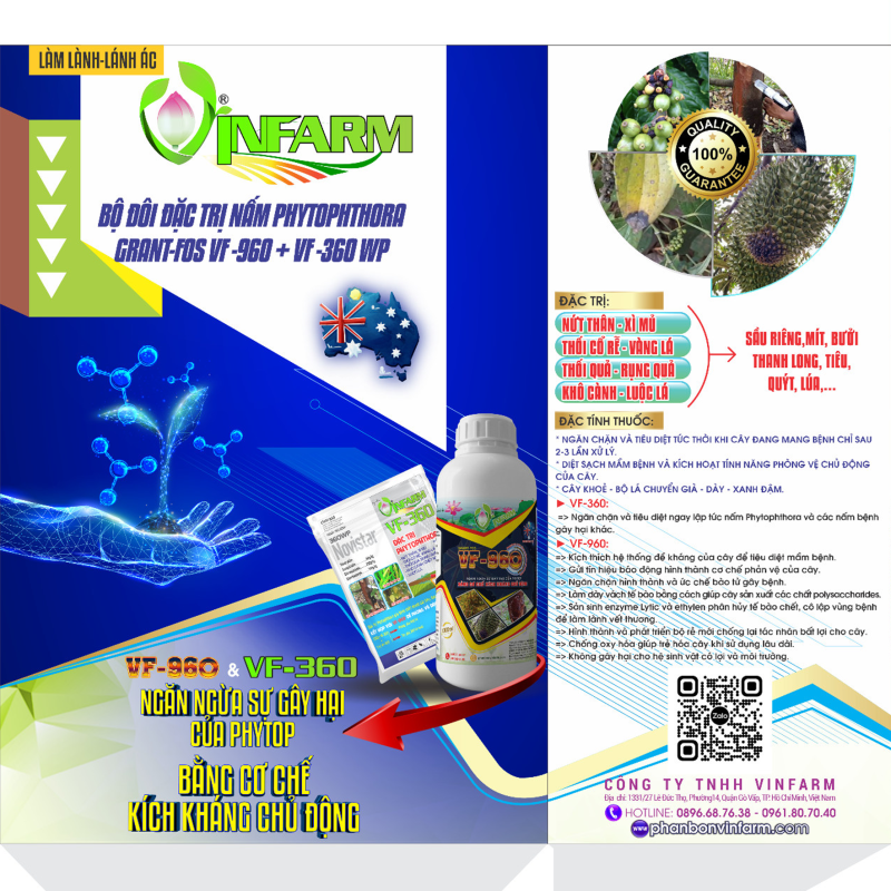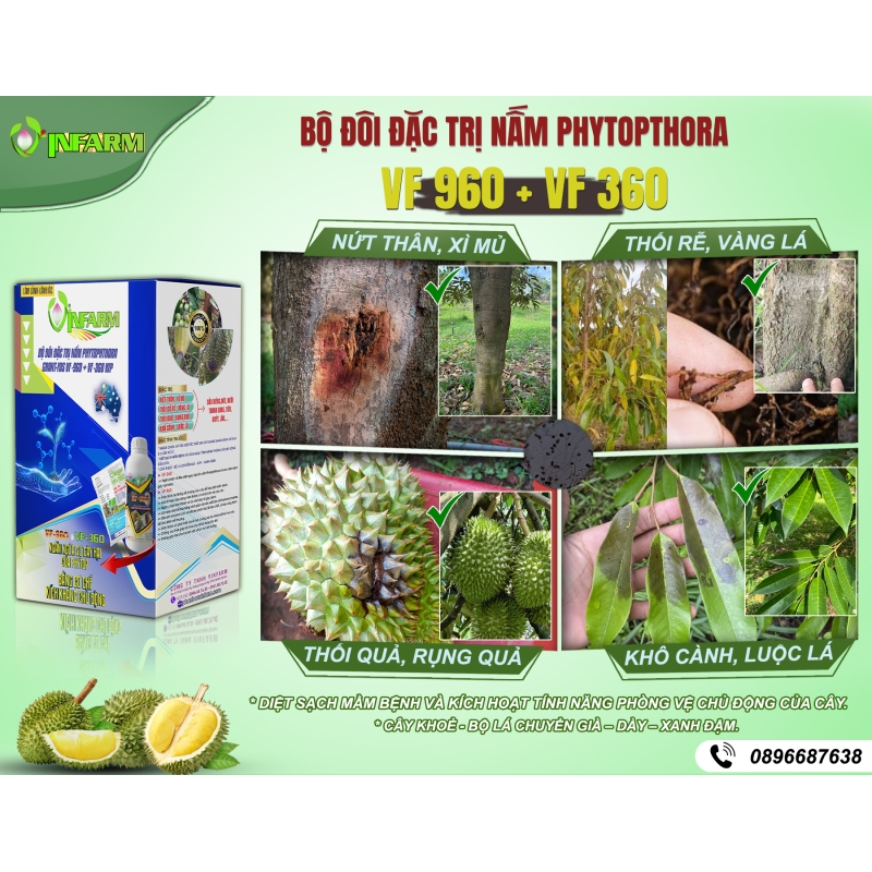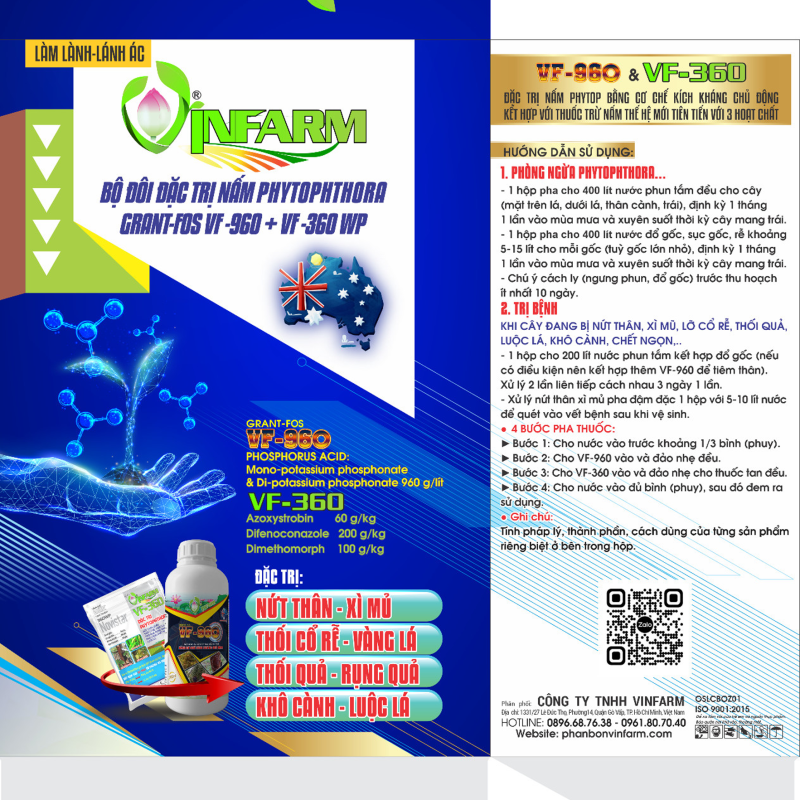 Bộ đôi VF 960 + VF 360 chuyên xử lý các bệnh do nấm Phytophthora và nhiều nấm hại rễ – thân – lá, gồm:
