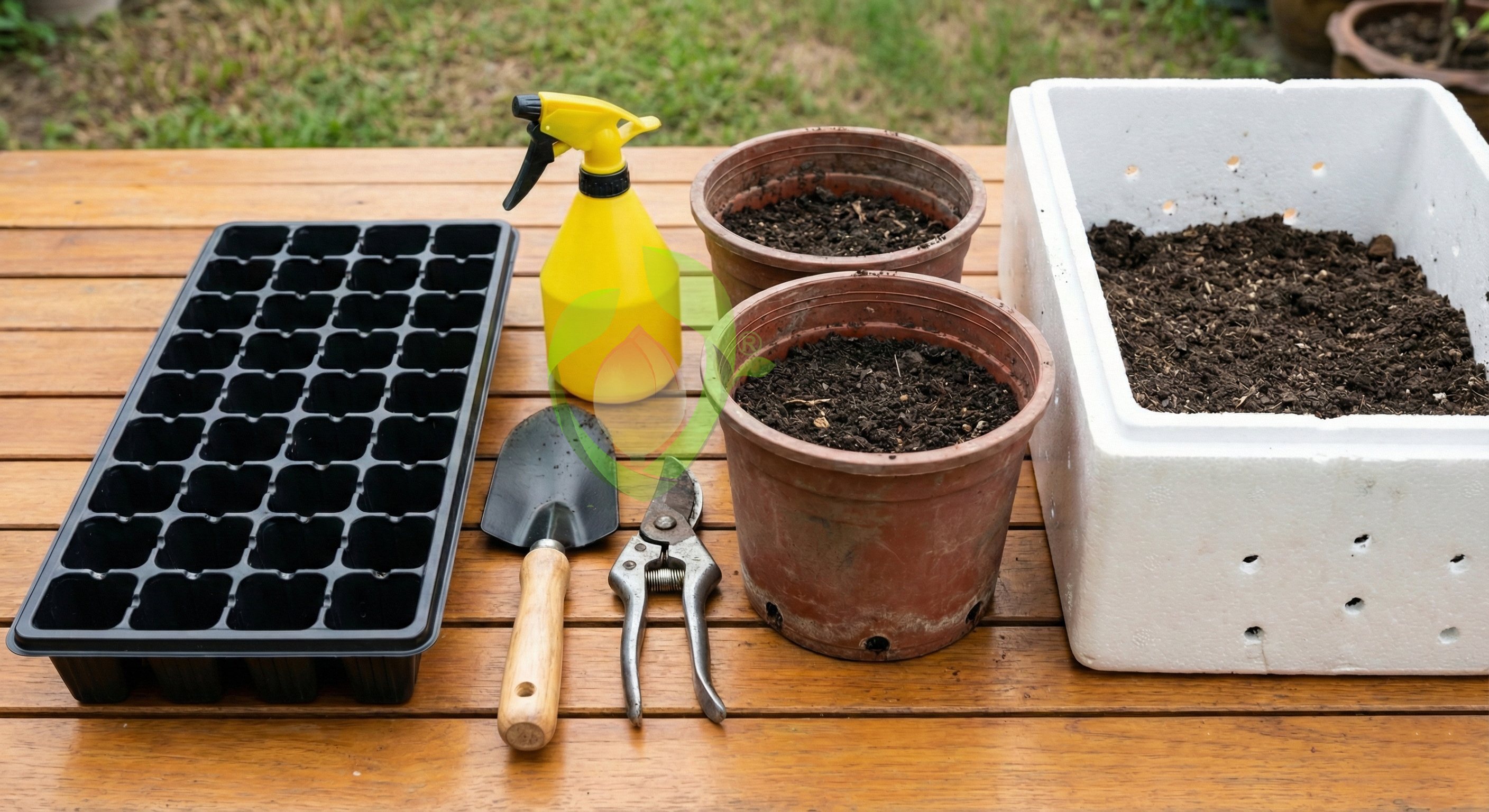 - Bình tưới phun sương hoặc vòi sen nhẹ