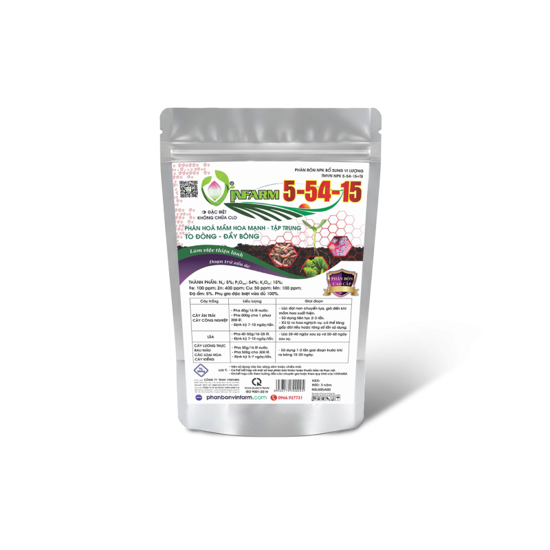 VINFARM 5-54-15 là dòng phân lân cao – kali vừa, giúp cây tập trung nuôi mắt hoa, hình thành mầm hoa mạnh và ra bông tập trung, đặc biệt hiệu quả cho cây ăn trái và cây công nghiệp.