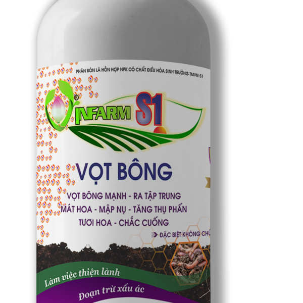 VINFARM S1 là sản phẩm chuyên dùng cho giai đoạn ra bông, giúp cây ra hoa mạnh – đồng loạt – hạn chế rụng hoa, tăng đậu trái. Sản phẩm được sản xuất trên nền nguyên liệu Axit Amin tự do + Rong biển giúp cây hấp thu tối đa dưỡng chất, hiệu quả nhanh, mát bông, mát cây...đồng thời cộng với hoạt chất sinh trưởng cần thiết cho quá trình kéo dài bông, ra đồng loạt, mập bông, sáng bông, hạn chế rụng bông và khô đen bông